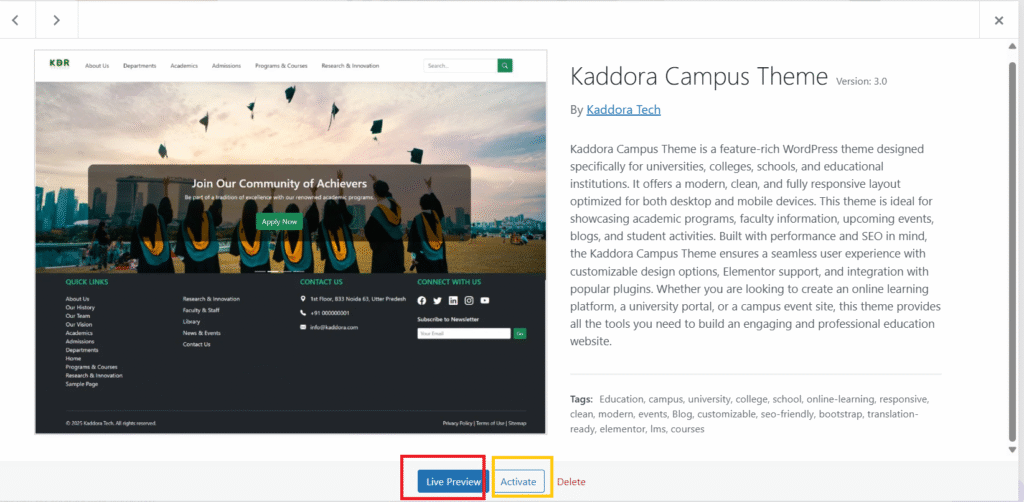 First of all, thank you for choosing Kaddora Education – College, University & Campus LMS WordPress Theme. This documentation is created to help you get started building your educational website with ease. Here, you will find detailed instructions on installing the theme, setting up your site, and using all the powerful features included.