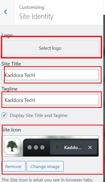 - Site Identity: Upload your logo, set the site title, tagline, and favicon.