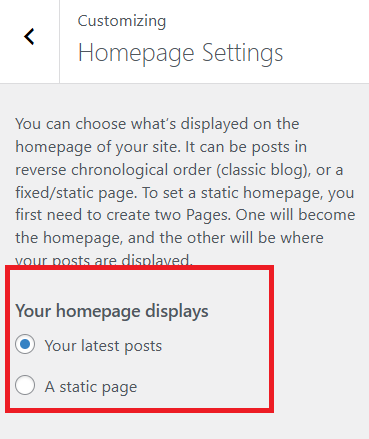 - Homepage Settings: Choose a static front page or show your latest posts.